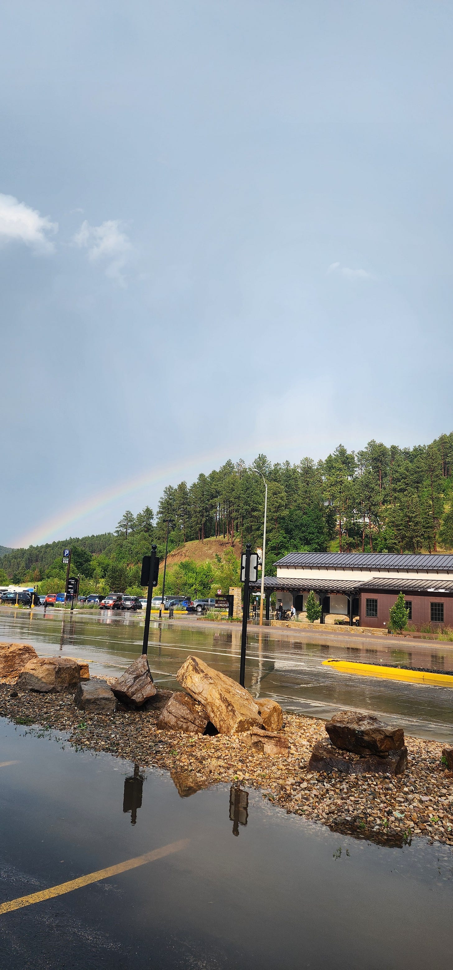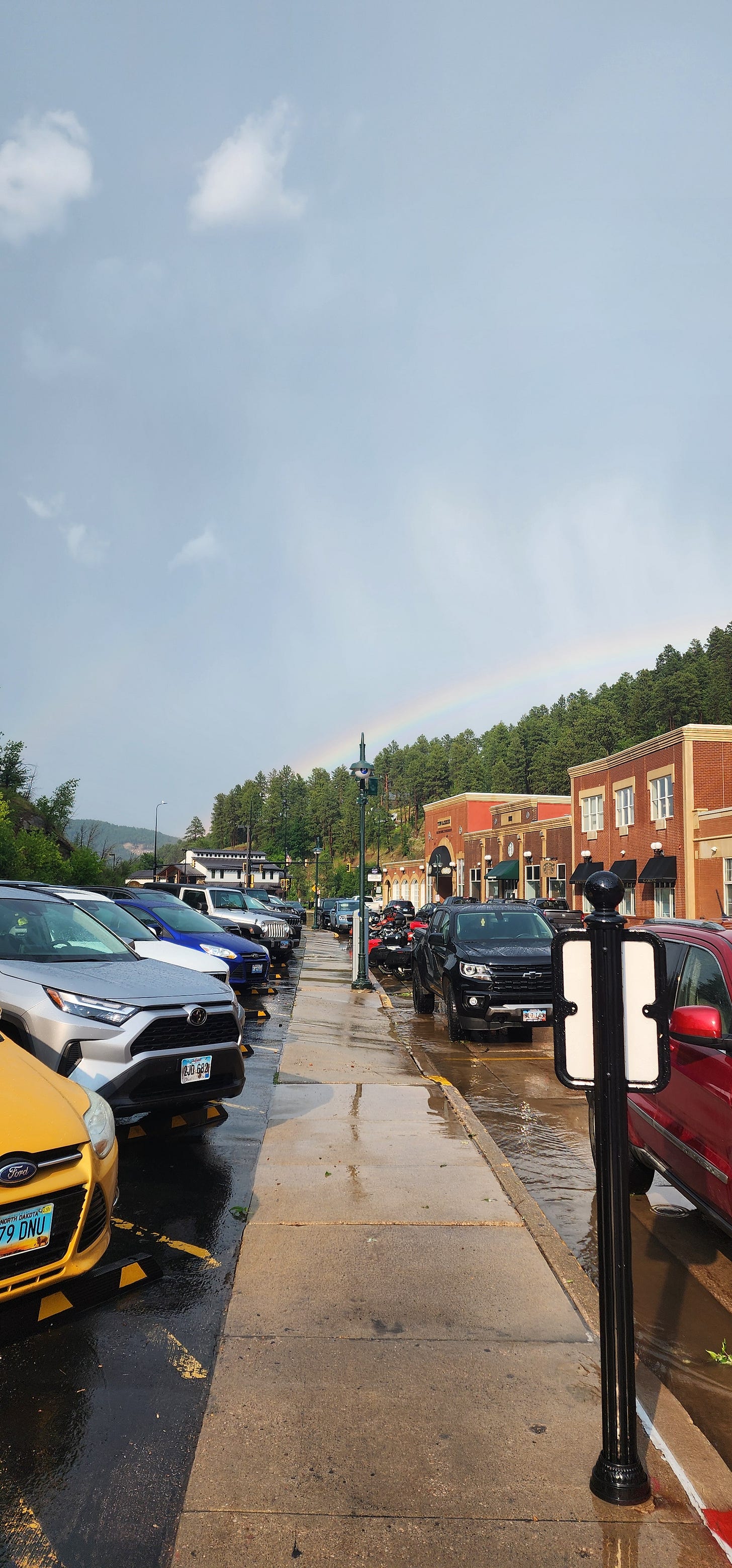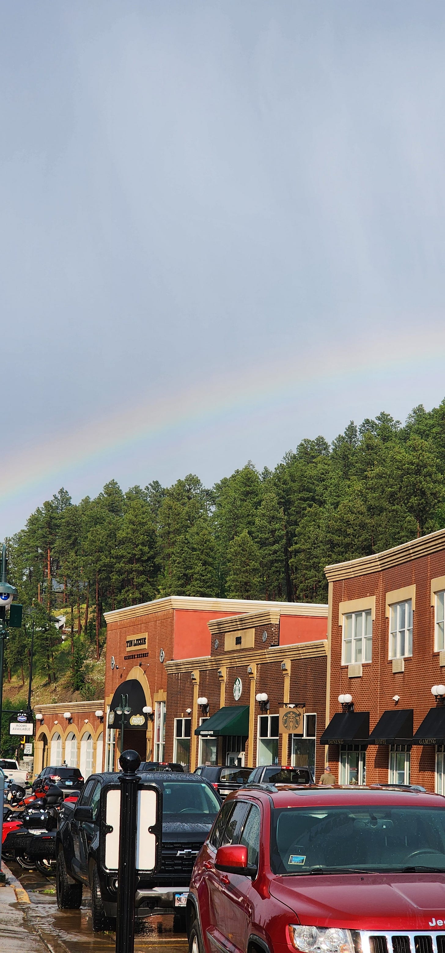 A summer storm came through on July 28th and dumped rain on Main Street for about forty minutes. That was my first week on the hill. When the storm stopped, a rainbow came up over the canyon wall and arched directly over the casino storefronts. The wet pavement reflected everything back. Rock boulders sat in puddles in the median. The kind of boulders you only see in a median because someone blasted them out of a hillside to build a parking lot. Ponderosa pines on the ridge were still dripping.