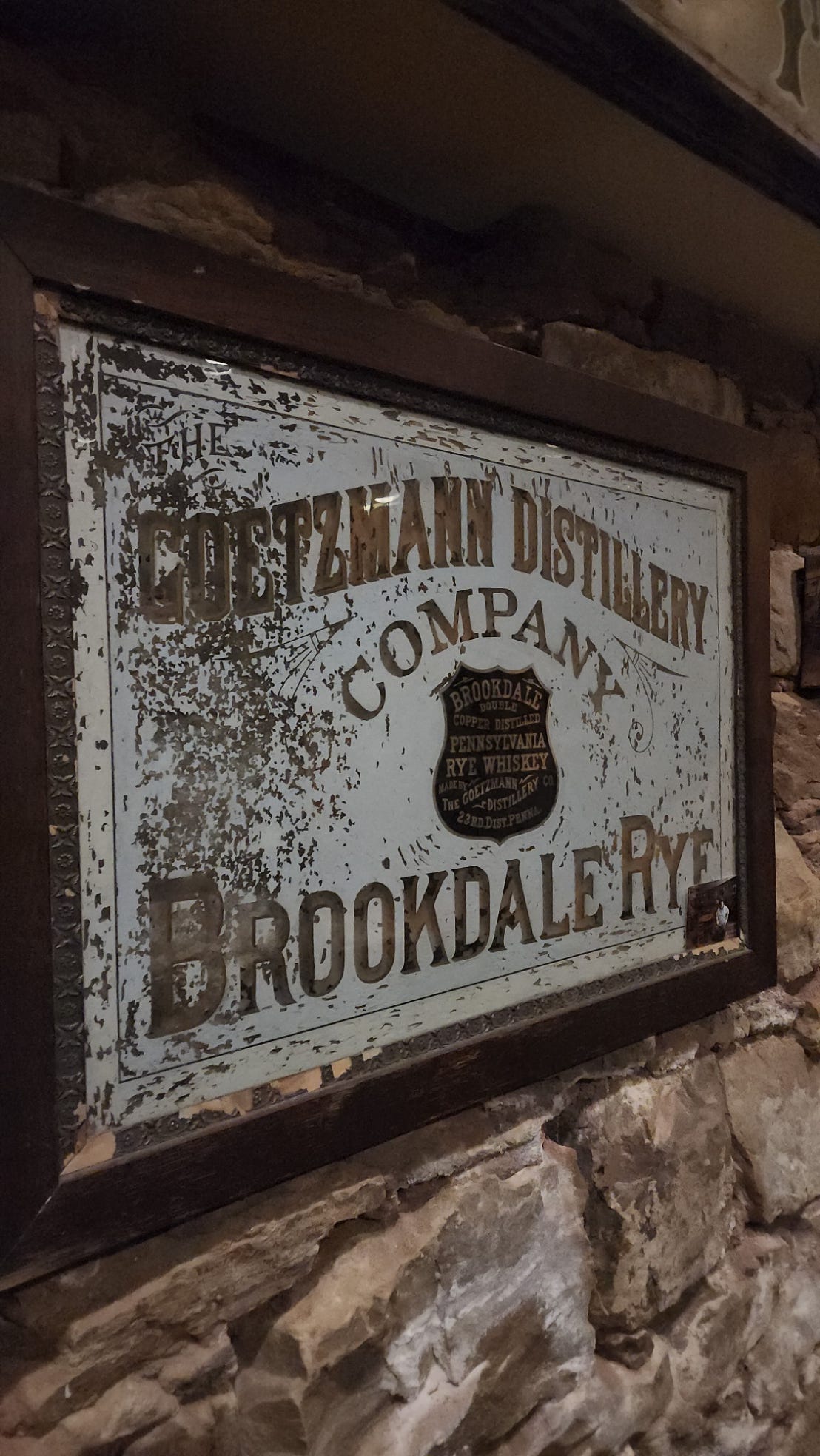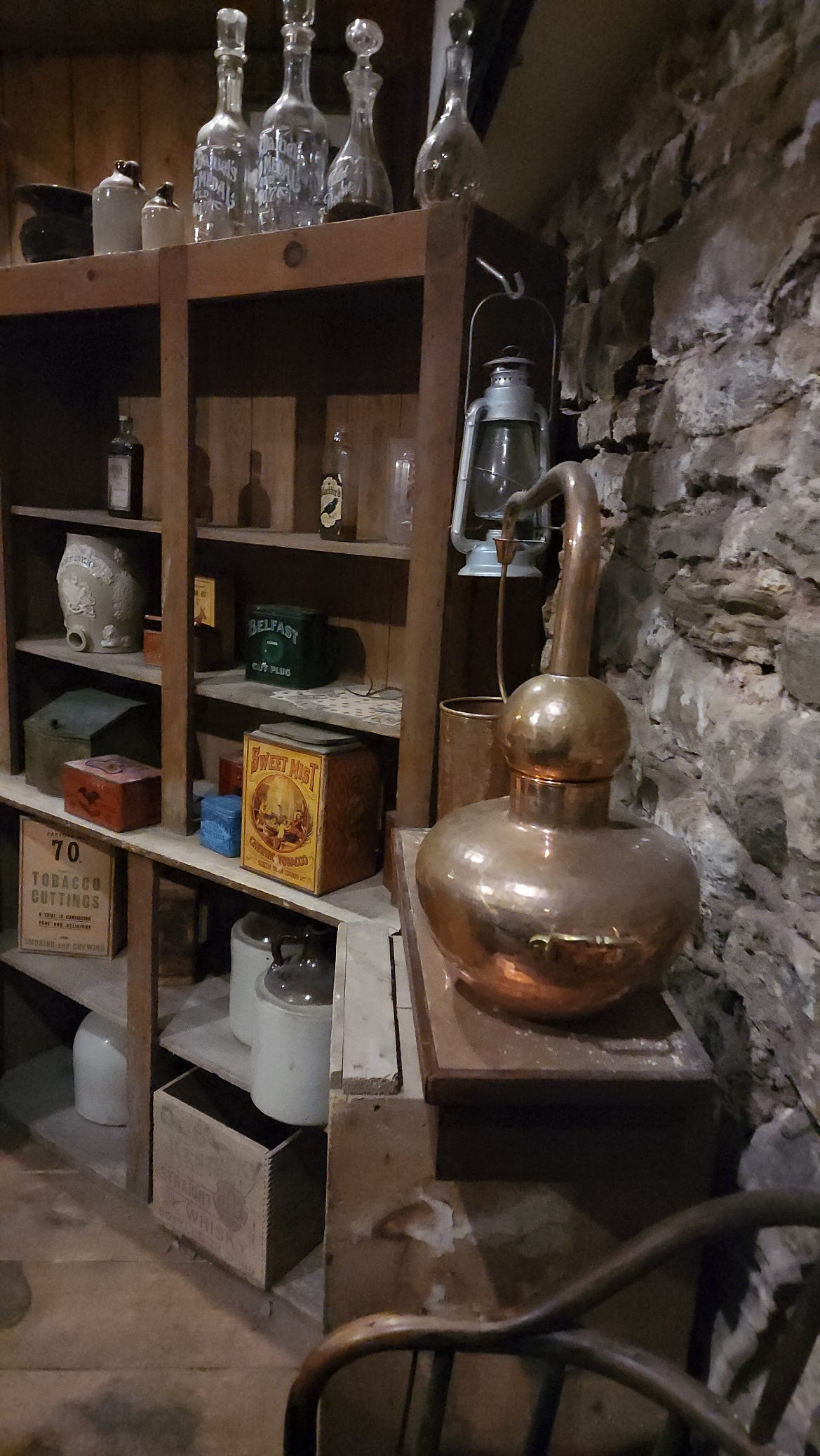 The back shelves hold everything a frontier saloon needed to stay open. Crystal decanters on top, Belfast Cut Plug tobacco, Sweet Mist chewing tobacco tins, a copper pot still, stoneware jugs, an oil lantern, horse tack hanging on the left wall. On the stone wall, a Goetzmann Distillery Company mirror, Brookdale Rye, paint peeling off the frame, silver going dark. Pennsylvania rye whiskey advertised on the wall of a South Dakota saloon in a Black Hills canyon in 1876.