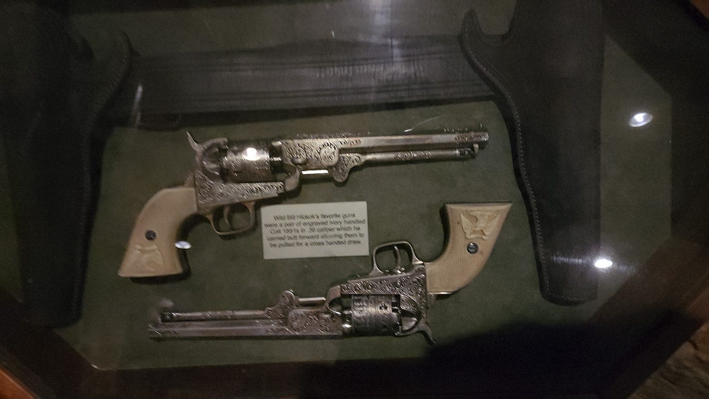Replicas of his guns are in a case nearby. Two engraved ivory-handled Colt 1851s, .36 caliber, carried butt-forward so he could cross-draw with either hand. He wasn't holding them when McCall came in.