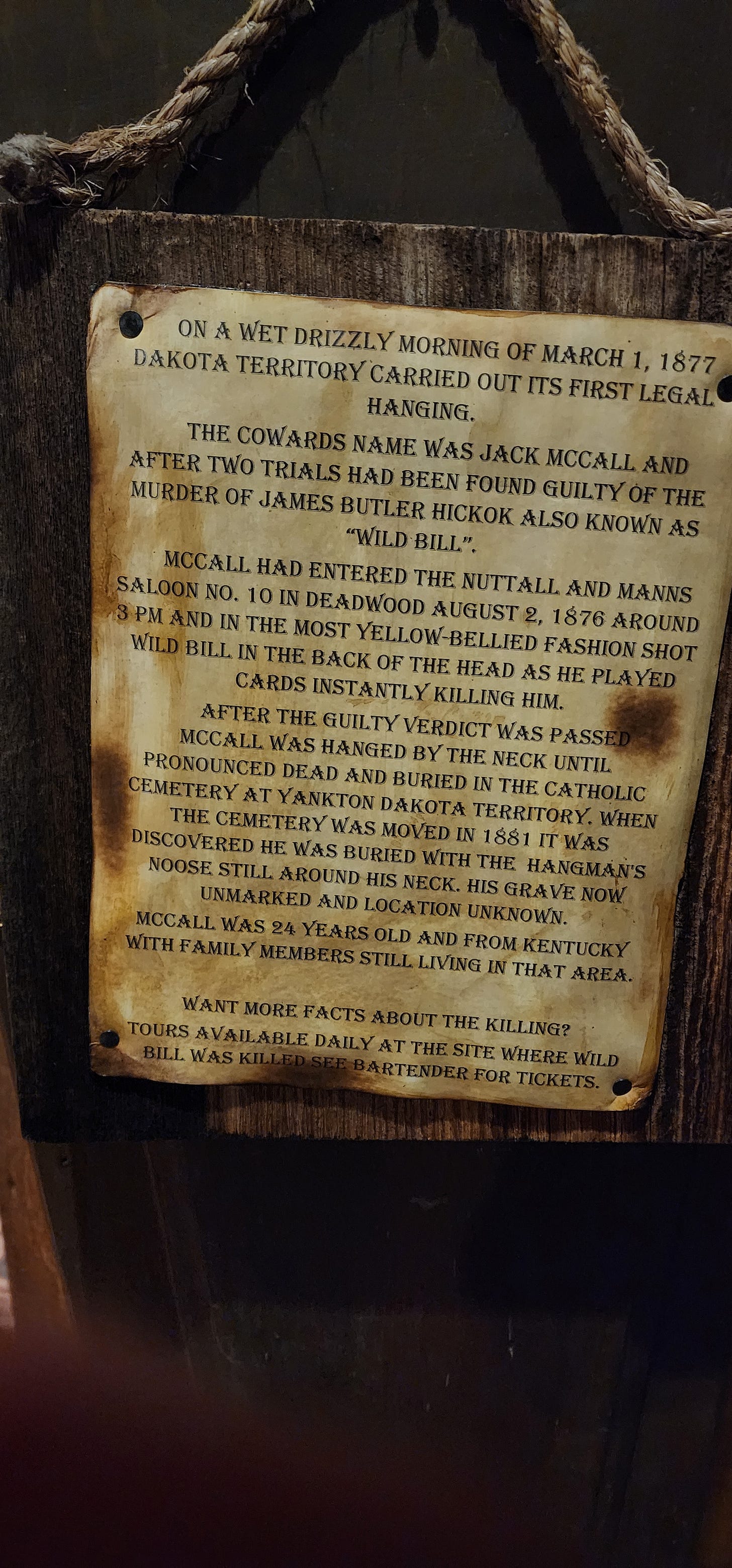 Wild Bill Hickok showed up in Deadwood looking for fortune in the summer of 1876. Three weeks later Jack McCall walked up behind him on August 2, 1876 and shot him in the back of the head at Nuttal and Mann’s Saloon. Hickok was holding aces and eights. They still call that the Dead Man’s Hand. McCall got caught about a block away. There’s a sign on Main Street marking exactly where. It hangs above a gift shop.