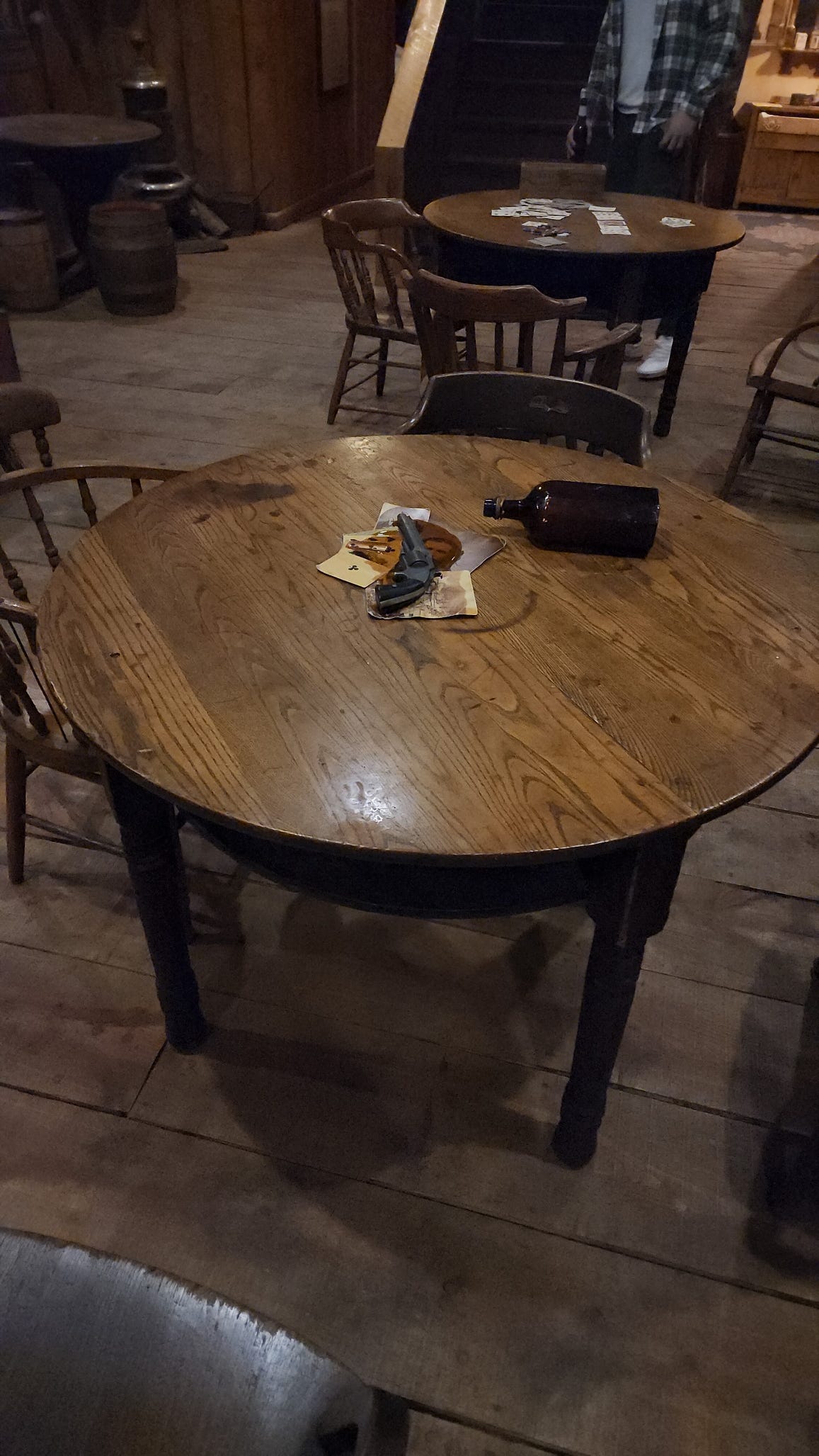 The card tables are still set up. Round wood table, chairs pulled out, cards laid down, a revolver sitting in the middle like someone just stepped away. A second table behind it, same setup. This is where it happened. Right here on this floor.