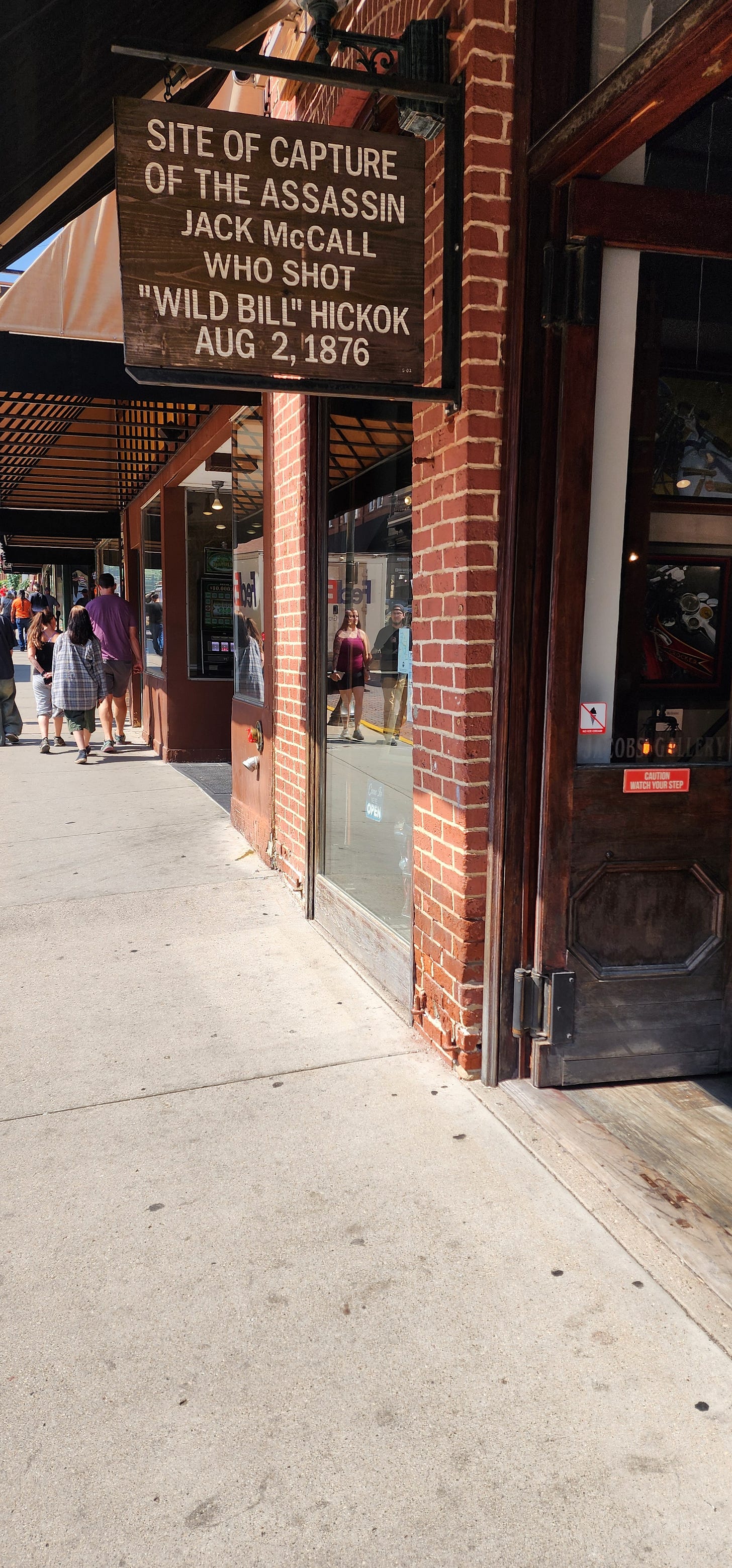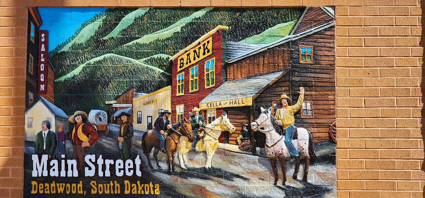 Deadwood sits at the bottom of a gulch carved by Whitewood Creek. You don’t see the town until you’re basically in it. The hills close in, the canyon narrows, and suddenly there’s a Main Street and a Starbucks and a casino and a sign that says someone got shot here in 1876. The sign is on a brick building. The brick building has a FedEx drop box in the lobby.