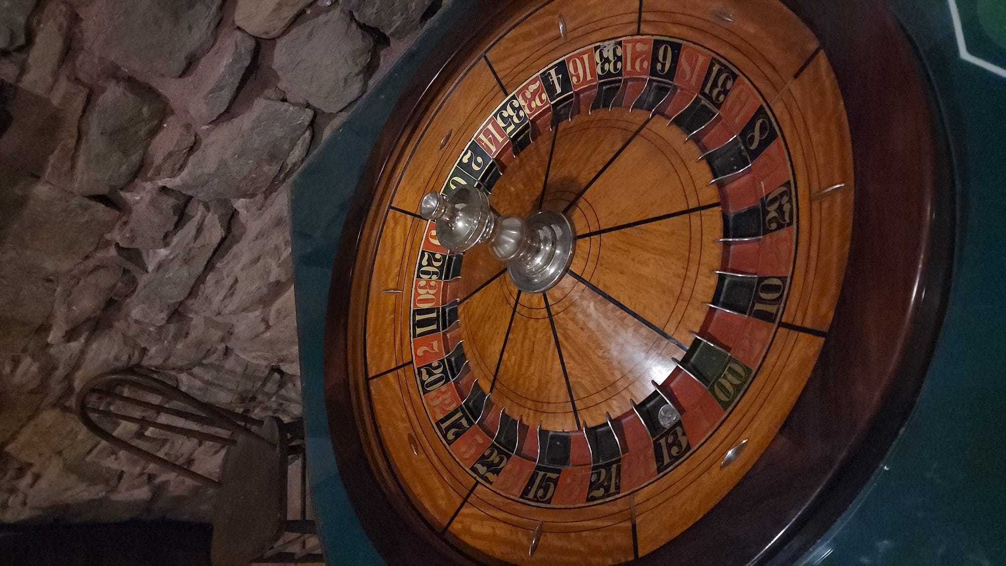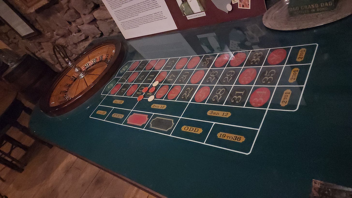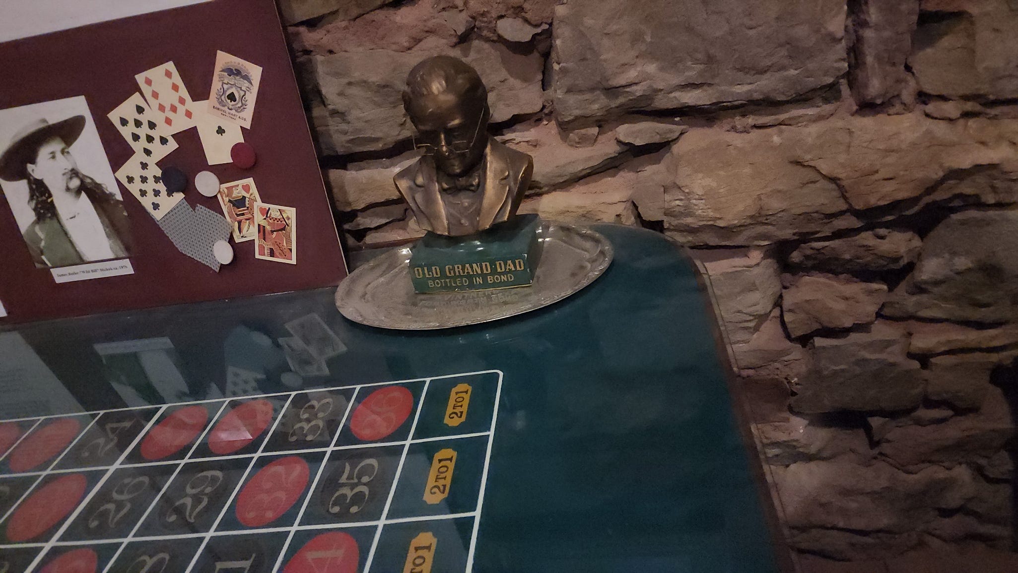 The roulette table is set in the corner, green felt, chips on the numbers, the original wood and brass wheel behind it against the stone wall. Wild Bill's photo is pinned to a board nearby, playing cards spread around him, a bronze Old Grand Dad Bottled in Bond bust sitting on a silver tray next to the wheel. Wild Bill watching the gambling from a corner of the room for 149 years.