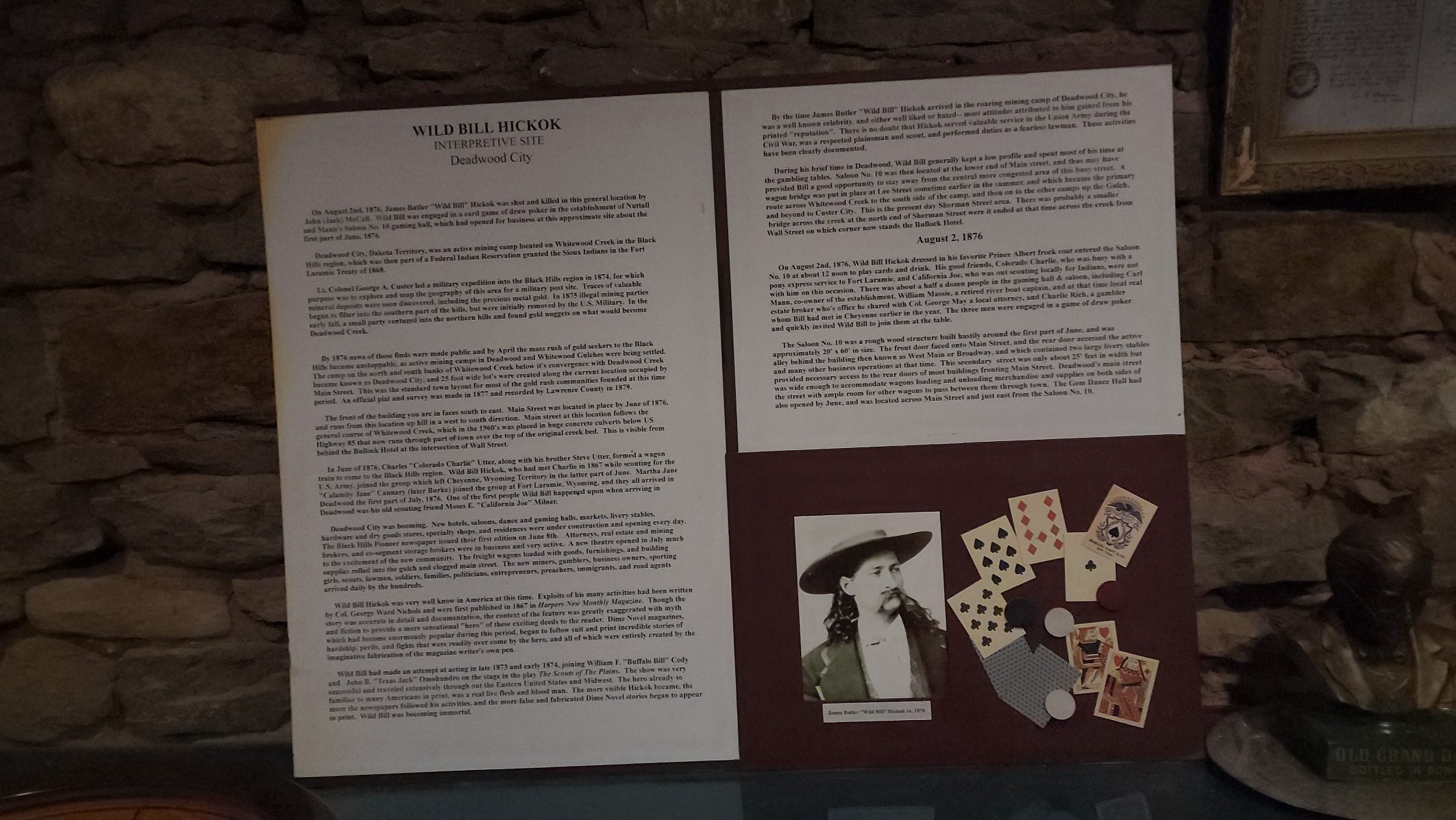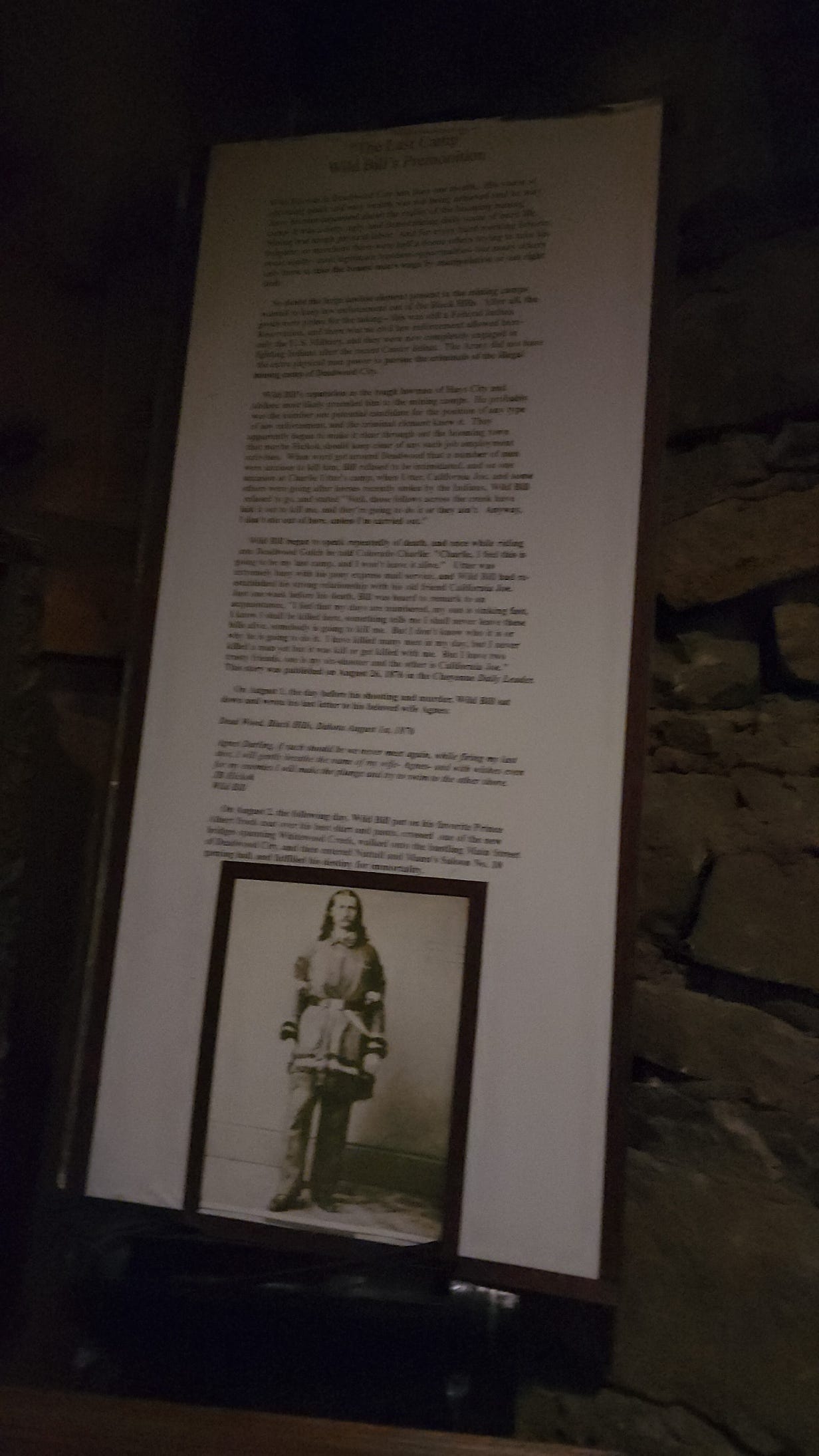 Two full interpretive panels on the wall lay out the whole story. The saloon layout in 1876. The card game on August 2nd. His last letter to his wife Agnes, written the day before. He told her if he never saw her again she should be a good girl. He said he didn’t know who was going to kill him but someone was going to do it.