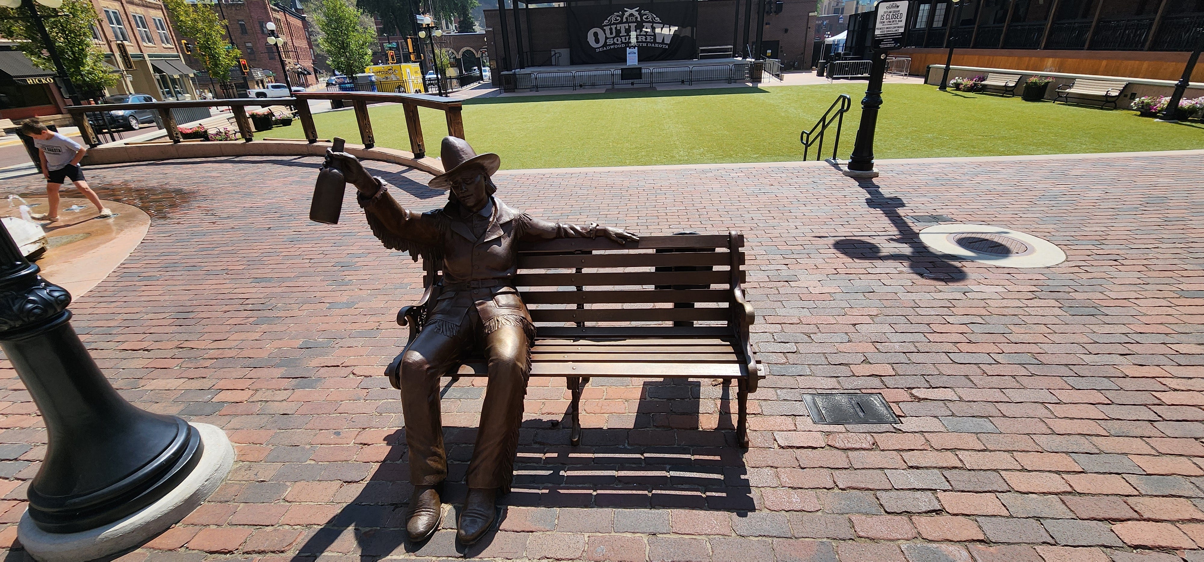 Calamity Jane is out there in Outlaw Square, bronze, sitting on a bench, holding a jug, fringe jacket spread wide like she owns the whole block. Martha Jane Cannary arrived in Deadwood in June 1876 in the same wagon train as Wild Bill. She outlived him by 27 years and ended up buried next to him at Mount Moriah Cemetery anyway.