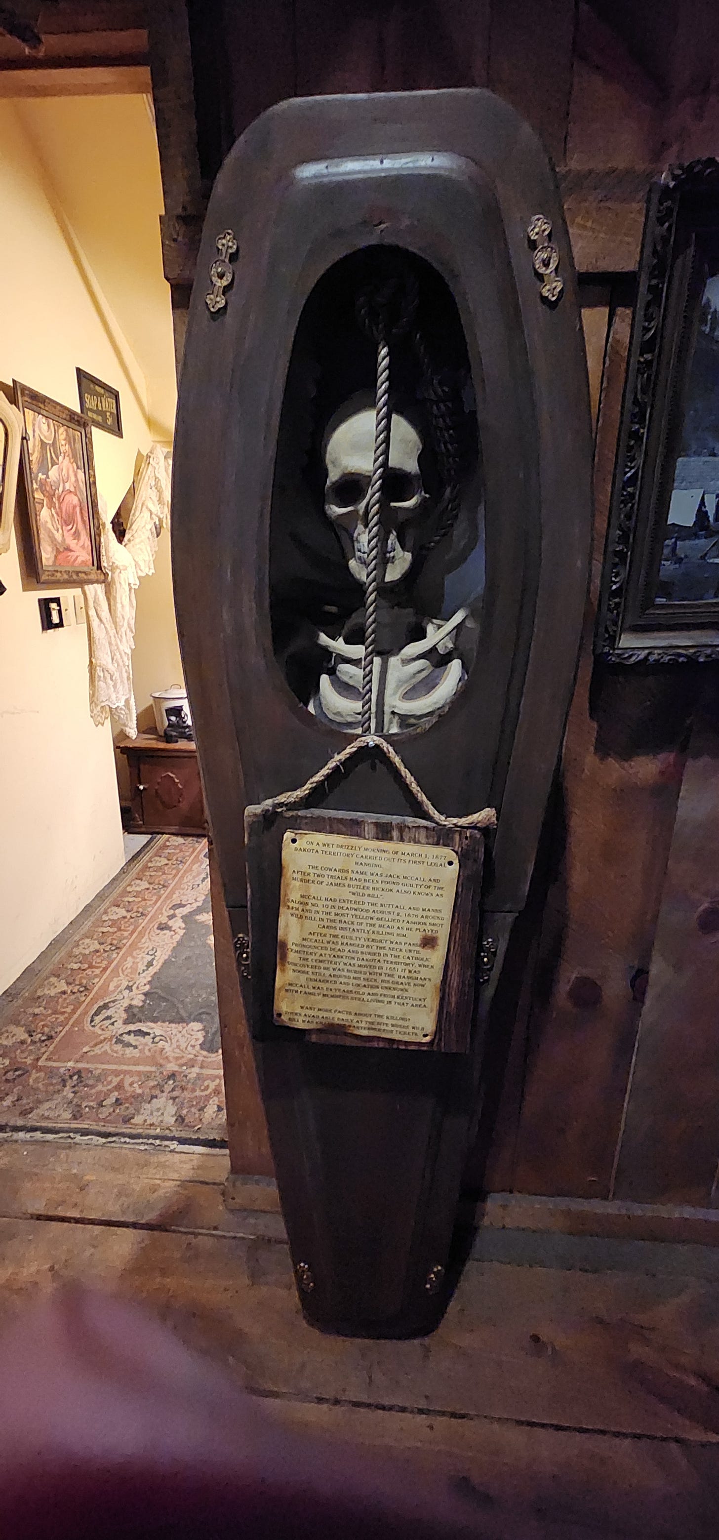 Near the entrance a coffin stands upright, skeleton and noose behind, with a plaque below that tells you exactly what happened. Jack McCall entered Nuttal and Mann’s Saloon No. 10 on August 2, 1876 around 3 PM and shot Wild Bill Hickok in the back of the head as he played cards. McCall was 24 years old and from Kentucky. On a wet drizzly morning of March 1, 1877, Dakota Territory carried out its first legal execution. When they moved the cemetery in 1881 they found McCall still buried with the hangman’s noose around his neck. His grave is now unmarked. Location unknown.