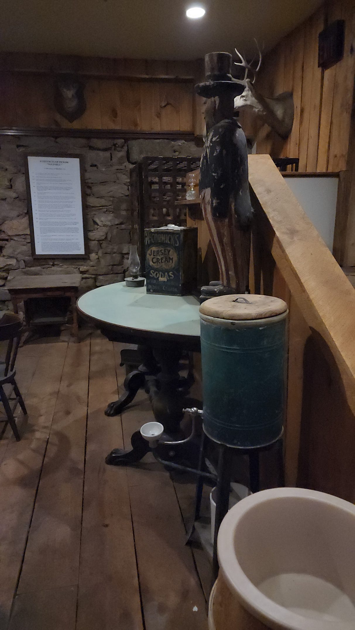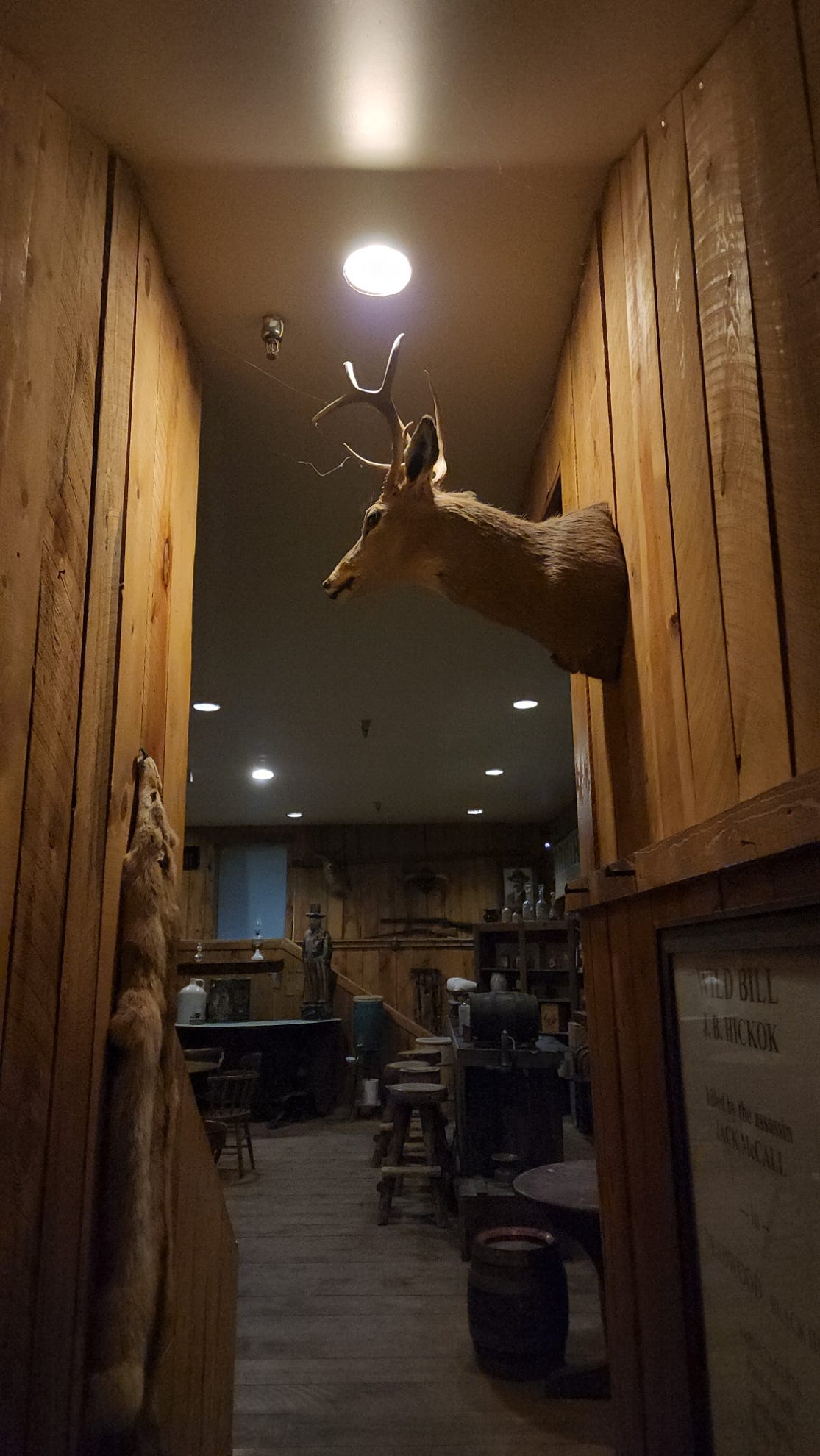 That’s where the real saloon is. Underground, stone walls, low ceilings, plank floors. The recreation of what Nuttal and Mann’s actually looked like in 1876 is down there in the basement, not up on the main floor with the barstools and the slot machines and the pressed tin ceiling. You have to go down to find it.