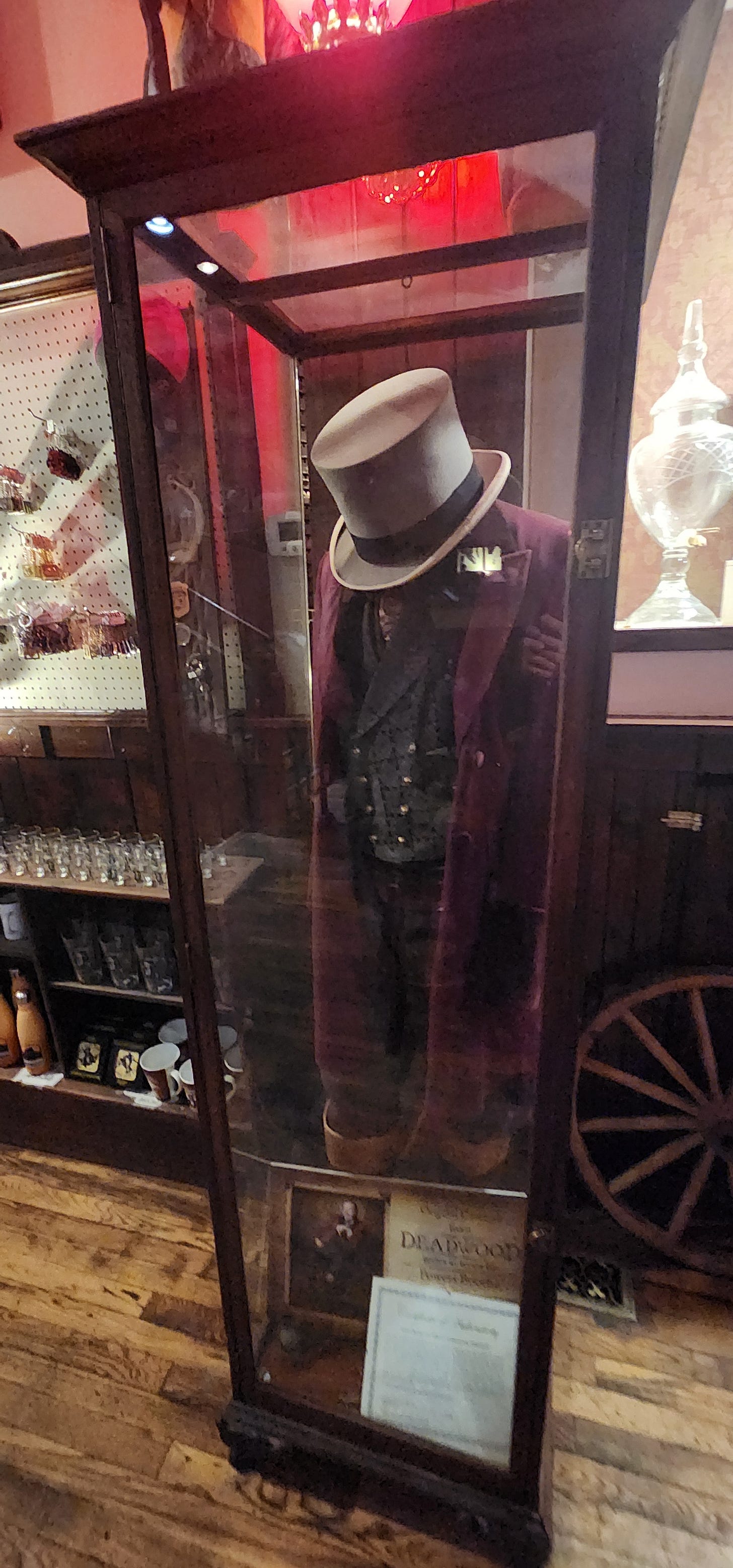There’s a glass display case in the main room holding what looks like a costume from the HBO series. Burgundy frock coat. Top hat. The plaque references the show. Al Swearengen’s coat, most likely. The real Swearengen was found dead in a Denver rail yard in November 1904. Blunt trauma to the head. Nobody was ever charged.