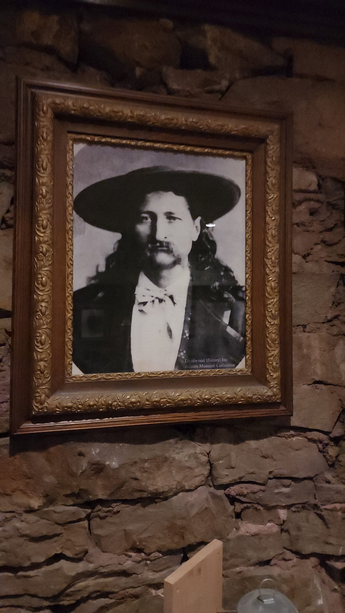 His portrait is on the stone wall. Wide brim hat, long dark hair, knotted necktie. Credited to the Deadwood History Inc. Adams Museum Collection. He's looking at something past the camera. He looks like a man who knew something was coming but not when.
