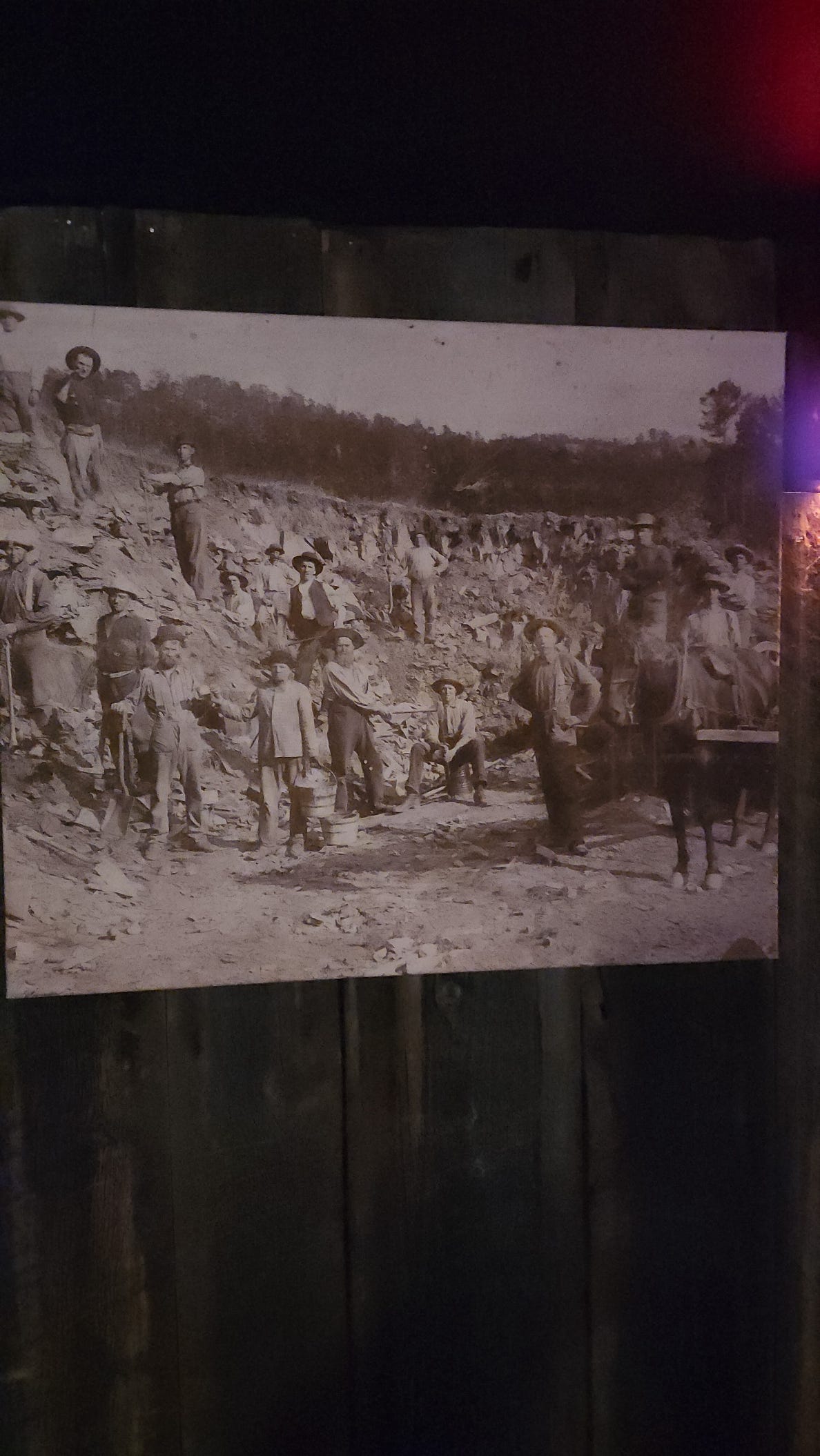 On the back wall, an old photograph. About 25 men on a blasted hillside, some on horseback, all staring at the camera. Rock cuts behind them. Trees at the top of the ridge. No equipment visible, just bodies and shovels and horses. This is Deadwood Gulch in 1876. This is what the hills looked like when the gold was still in them.