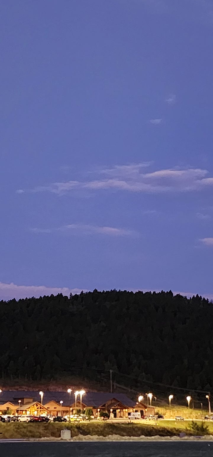 I stood on that street and looked up at the canyon walls closing in from both sides, the ponderosa pines dark against whatever light was left in the sky, and I thought about every morning I’d spent up on that hill watching the Black Hills do something impossible with the sunrise, and I thought: I should have had a drone up here.
