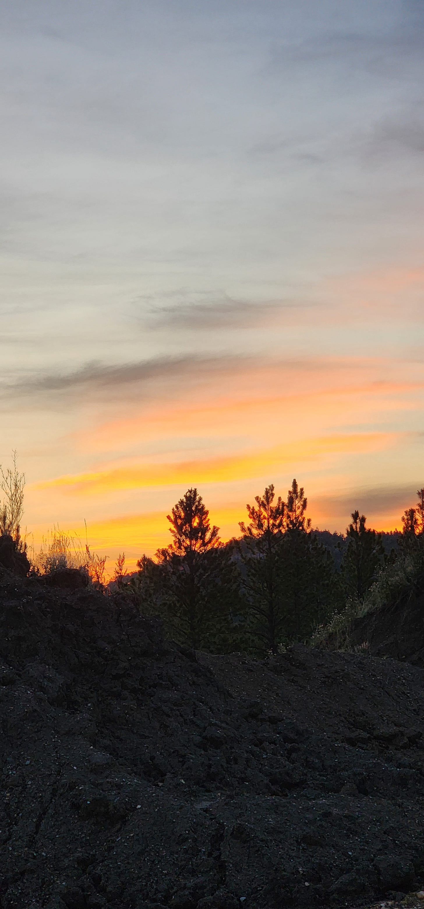 Still dark. Pines were black shapes. The sky was doing something orange and violent behind them. That particular color that looks fake in photos but lands different when you’re standing at 4,500 feet with nobody else around and you can smell the pine and the dirt and the cold air all at once.