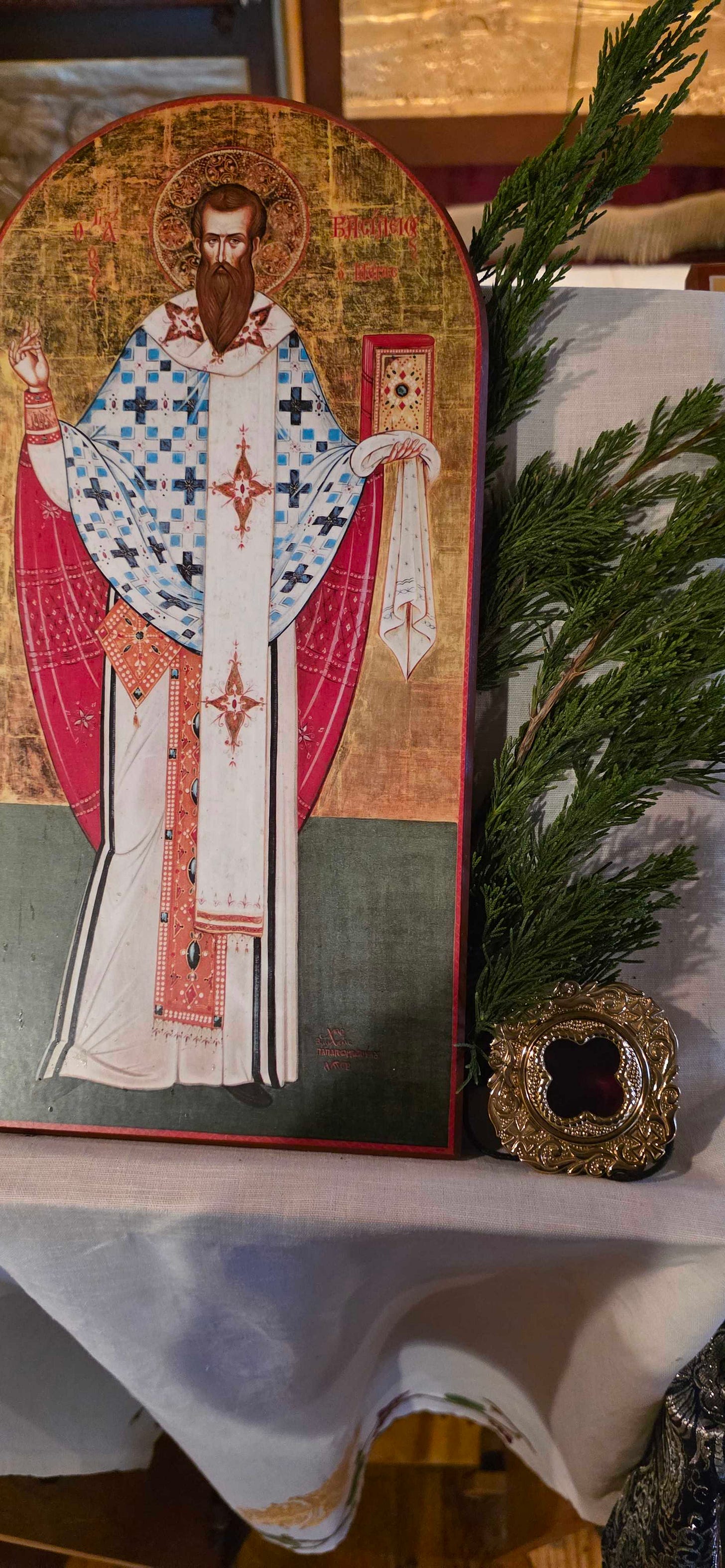 The reliquary next to the icon holds a piece of Saint Basil the Great from the 4th century AD. I forgot to ask what part of him this was.